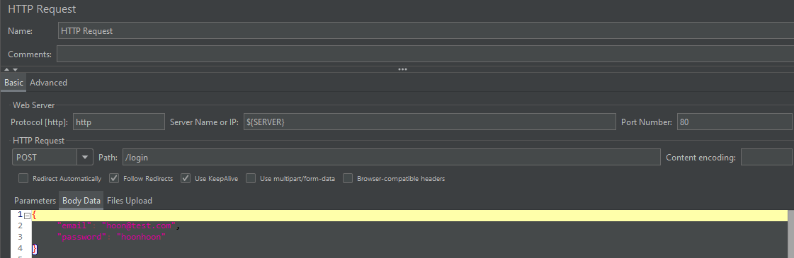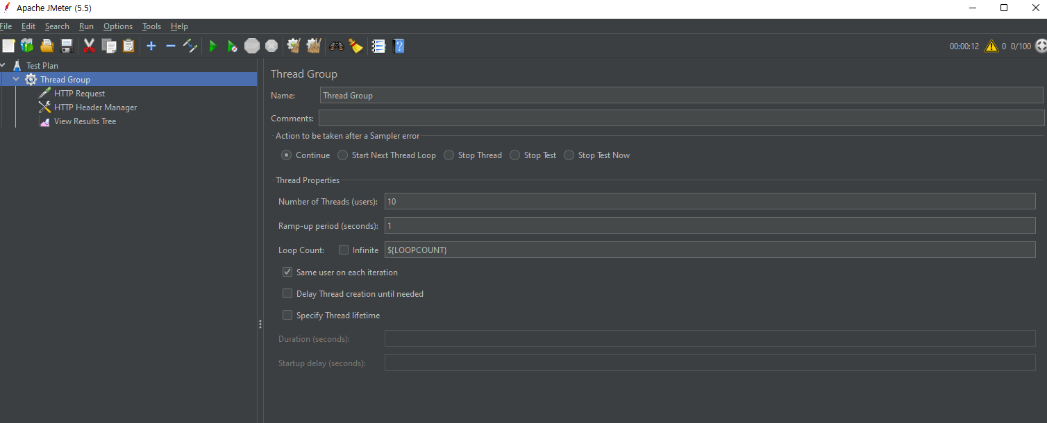- Loop Count : 테스트 반복을 수행할 횟수를 지정 ( Test Plan 에서 사용한 ${LOOPCOUNT} 사용 )