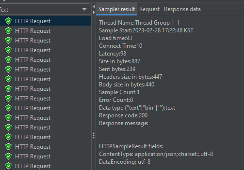 현재 LOOPCOUNT 를 2 로 지정하고, 한 테스트당 users 를 10 개로 설정하니 아래처럼 총 Request 가 20개 발생했다.